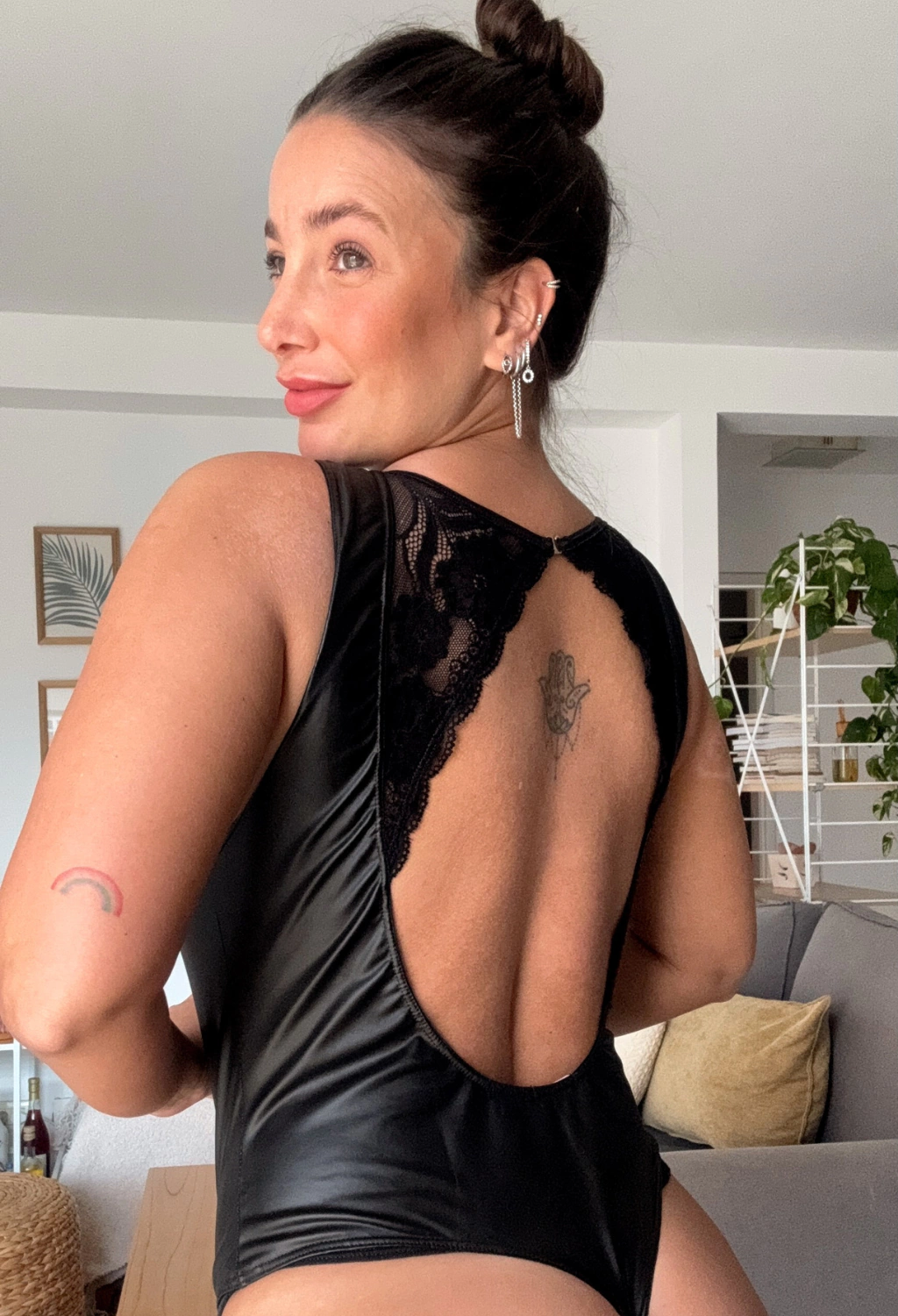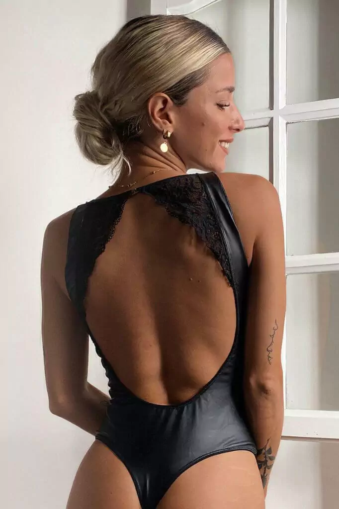 Body cuero vegano onix, modelo cuello redondo alto, con detalle de abertura en la espalda y encaje lo que hace que sea un modelo super canchero y versatil con cualquier look. Modelo elastizado. No trae ganchitos en la bombacha